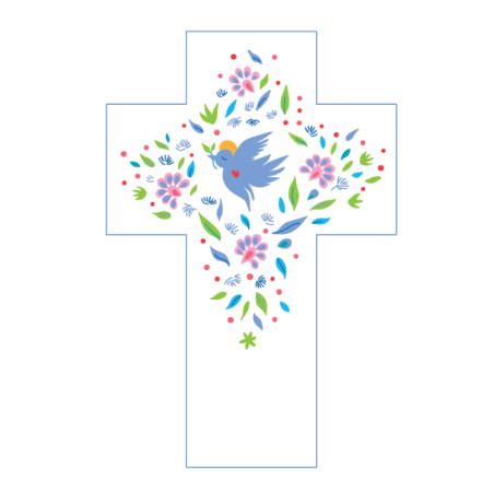 Croix de louange en bois avec colombe. Cette jolie croix pour enfant est peinte sur un fond blanc.